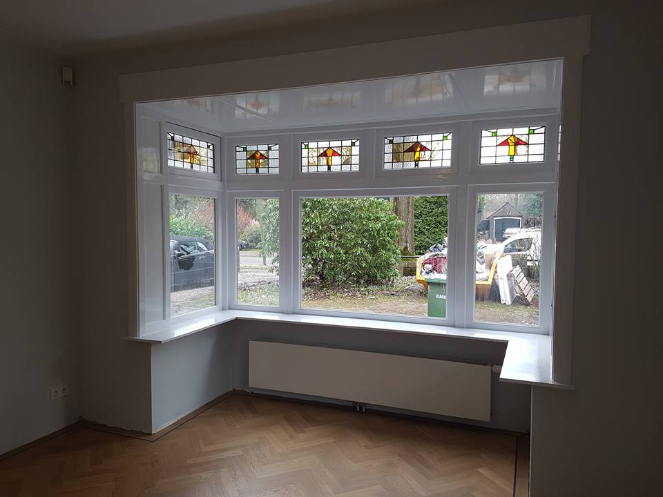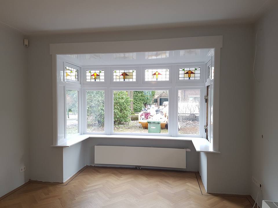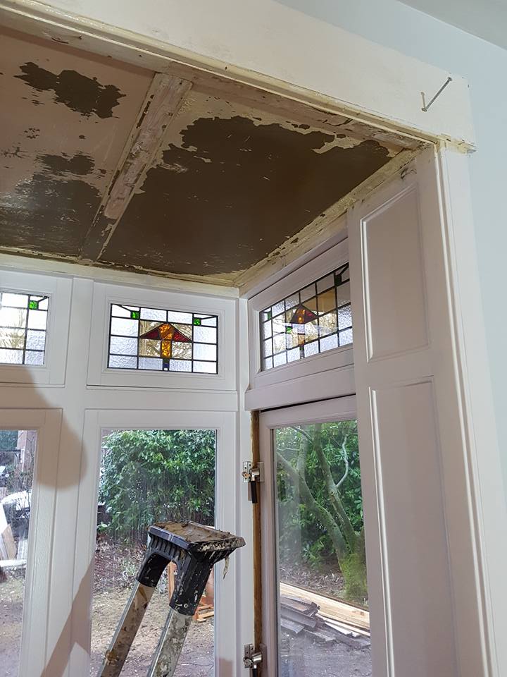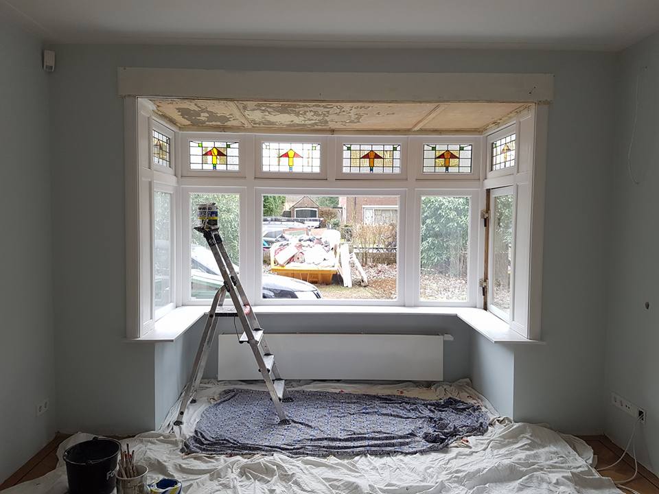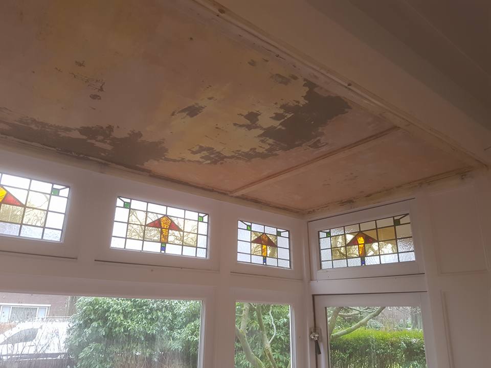 Plafond renovatie Een zeer slecht plafond.– In de afbijt gezet.– kaal gemaakt.– schoongewassen & gerepareerd.– twee lagen dik in grondverf gezet.– afgekit & afgeschilderd met een zeer sterke hoogglans lakverf.